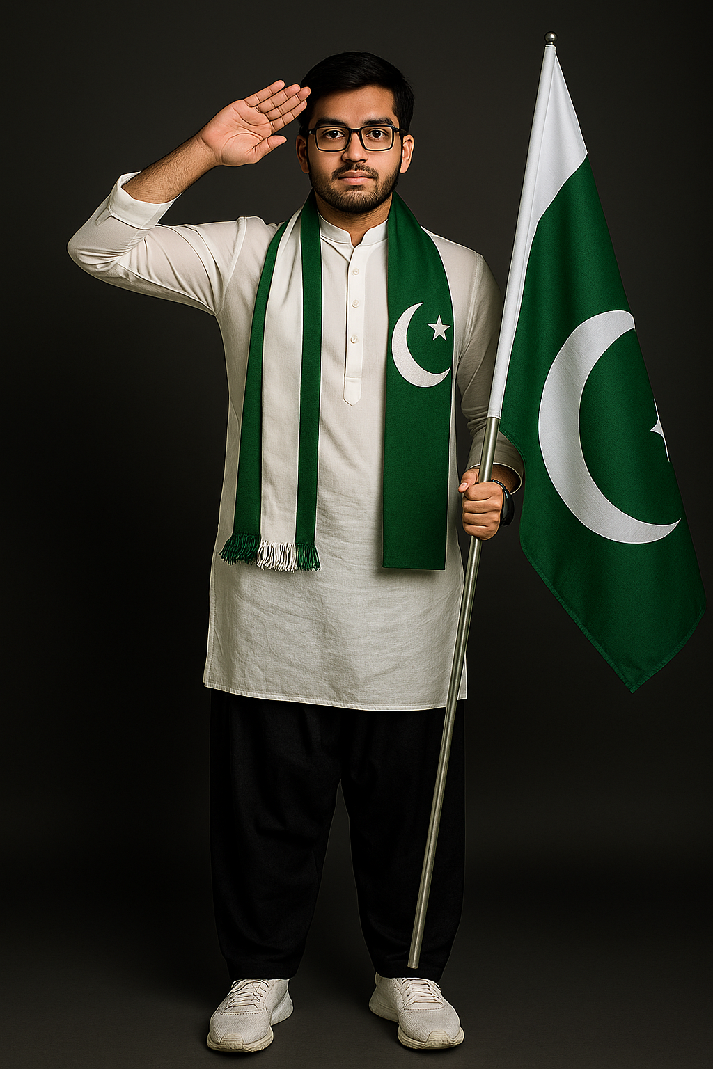 A proud 24-year-old Pakistani man stands in a full-body portrait, saluting with his right hand. He wears a stylish white kurta, black lungi, and white running shoes. A green and white scarf (symbolizing the Pakistani flag) is draped around his neck. He also wears a black smartwatch and black glasses. In his left hand, he holds a large Pakistani flag on a tall stick. The background should be a matte dark grey studio setting, with soft gradient lighting to emphasize facial features and rich fabric texture.