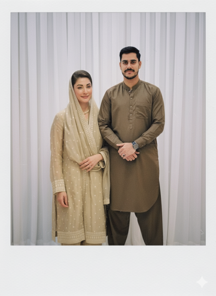 He wears a crisp white shirt with a green and white scarf draped around his shoulders, inspired by the Pakistani flag. A crescent and star badge is pinned to his chest.